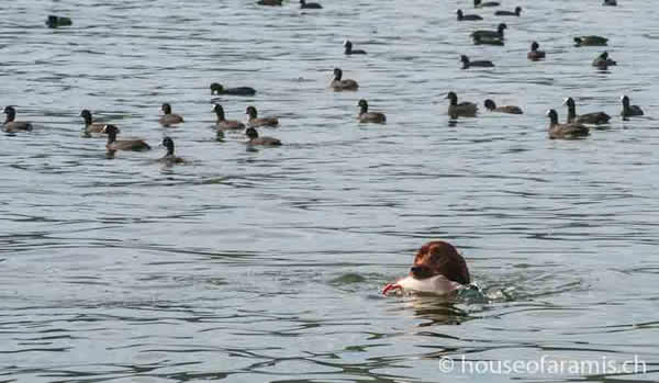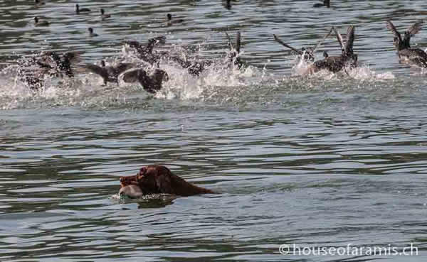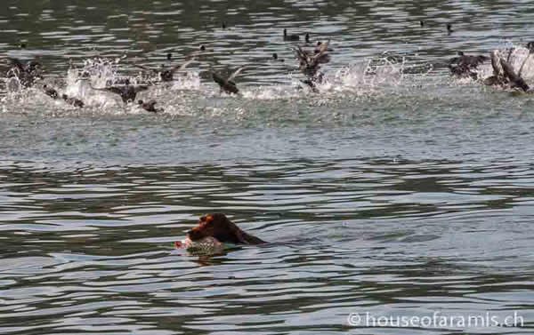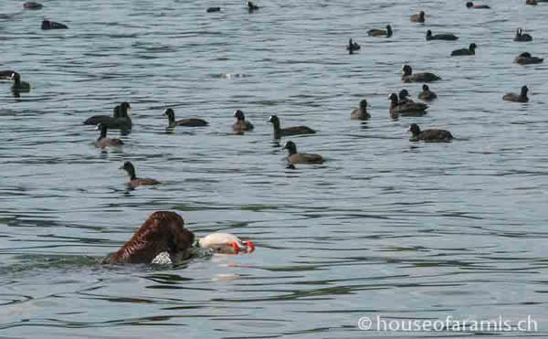 Wir trafen am Bodensee eine Versammlung von weit über 200 Blässhühner, Stockenten und ein paar Schwäne. Ob der Apport aus dem Wasser auch unter solchen Umständen klappt?