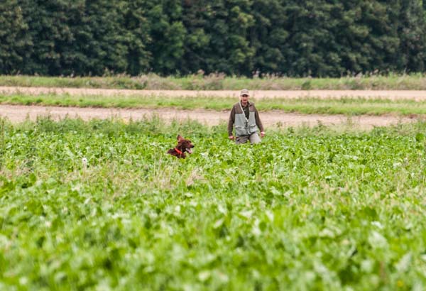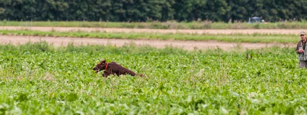 Zur Verfügung standen lauter Rübenfelder. Leider war der Bewuchs teilweise schon sehr hoch. Sehr vorteilhaft für die Fasane und kräftezehrend für die Hunde. Jerry begann mit einer sehr guten schöne Suche musste aber dem kraftvollen Stil Tribut zollen.