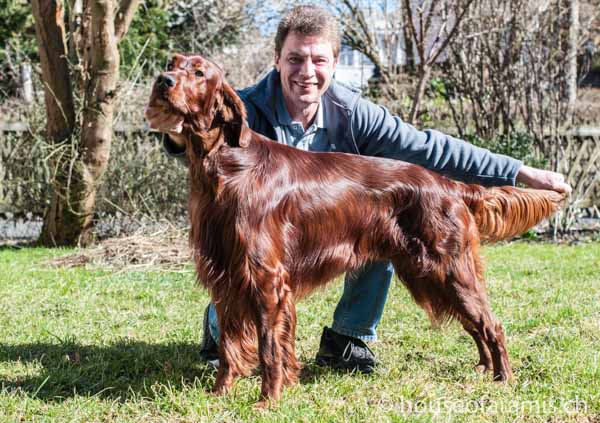 Die erste Ausstellung des Jahres besuchten wir in Fribourg. Jerry erhält in der Gebrauchshundeklasse ein V2 Res. CAC. Nachdem so selten ein Irish-Setter in dieser Ausstellungsklasse gezeigt wird, waren es heute sogar zwei Rüden. Jerry und Arpad hatten starke Konkurrenz von einem irischen Showrüden, professionel präsentiert von einem Handler!! Dafür war die offene Klasse nur mit 2 Rüden besetzt.